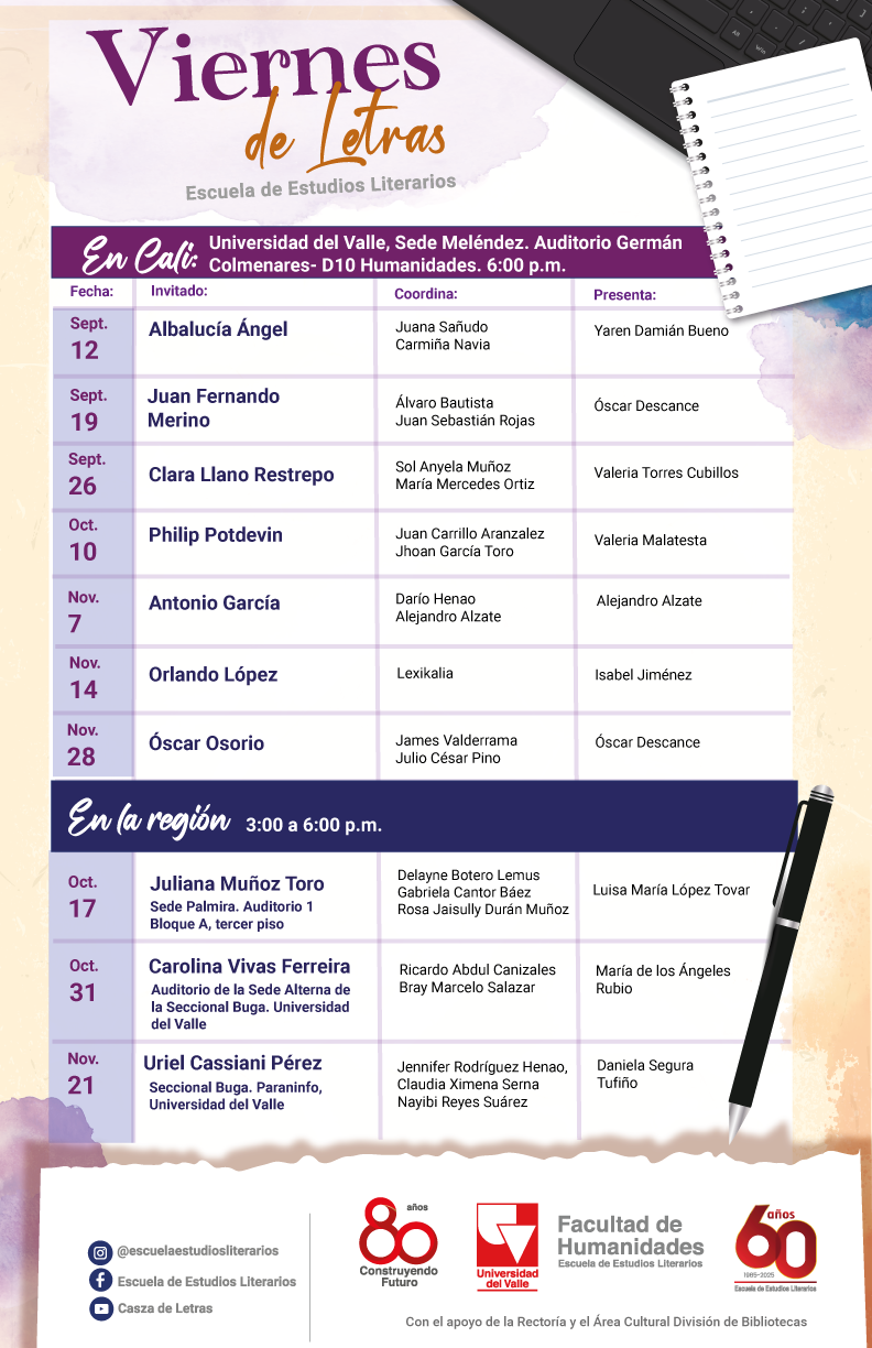 En el marco de los 80 años de existencia de la Universidad del Valle, celebramos este 2025 el sexagésimo aniversario de creación. Como parte de los festejos por estas efemérides, iniciaremos este 7 de marzo la primera de las dos temporadas de Viernes de Letras. Durante estos once años nos han visitado cerca de 180 escritores y escritoras, con quienes nuestra comunidad universitaria ha compartido ideas sobre la creación literaria, sus métodos y realizaciones. Con el apoyo financiero de la Rectoría y logístico del Área Cultural de la División de Bibliotecas, este segundo semestre de 2025 contaremos con la participación de destacados escritores y escritoras: Albalucía Ángel, Juan Fernando Merino, Clara Llano Restrepo, Philip Potdevin, Juliana Muñoz Toro, Carolina Vivas Ferreira, Antonio García, Orlando López (Lexikalia), Uriel Cassiani Pérez y Óscar Osorio. En las sedes regionales de Palmira y Buga, nos acompañarán Juliana Muñoz Toro y Uriel Cassiani Pérez, respectivamente.